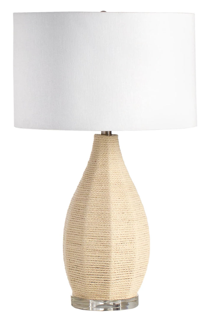 A facade of cream rope adds rich organic texture to the faceted base of this table lamp. Topped with a tailored linen shade to softly diffuse the light.