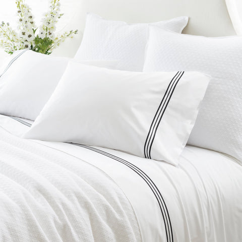 A simple, three-lined pattern adds a touch of refinement to this classic white, 400-thread-count cotton sheet set.