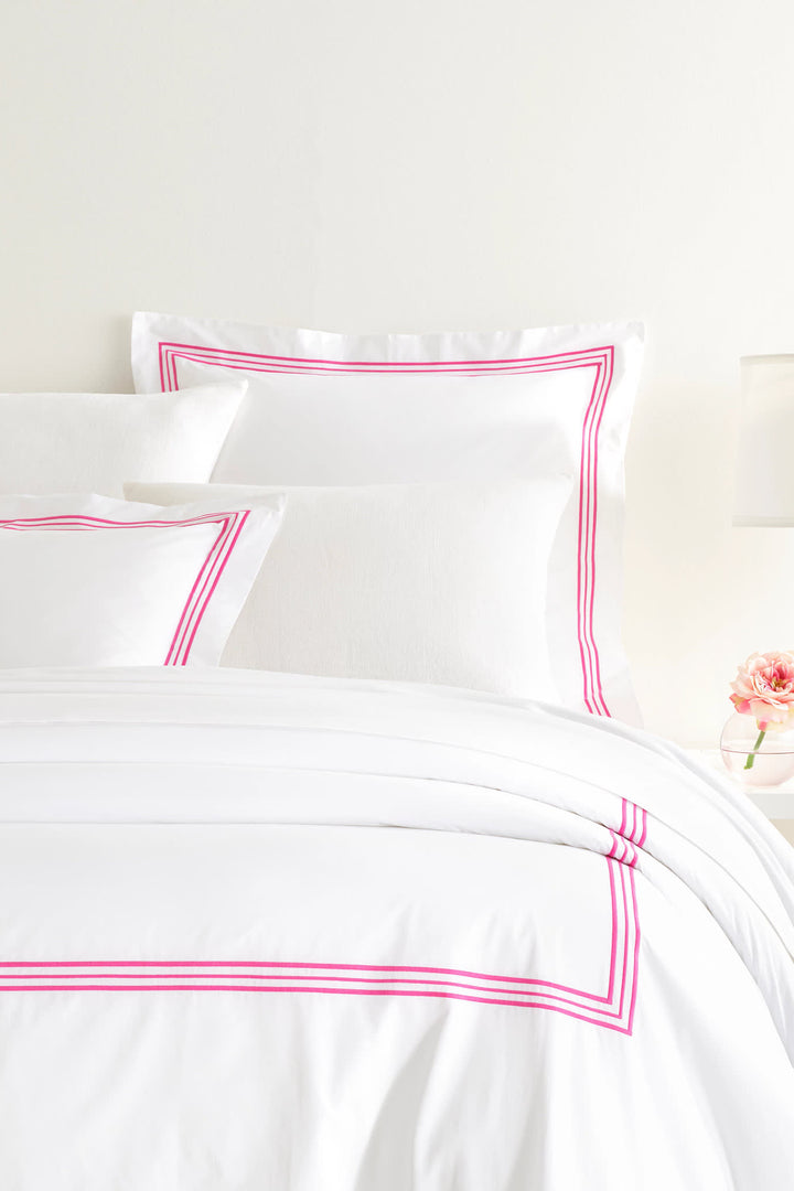 A simple, three-lined pattern adds a touch of refinement to this classic white, 400-thread-count cotton duvet cover.