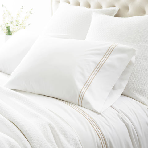 A simple, three-lined pattern adds a touch of refinement to this classic white, 400 thread-count cotton flat sheet.