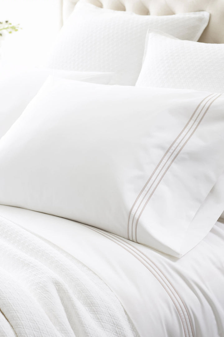 A simple, three-lined pattern adds a touch of refinement to these classic white, 400-thread-count cotton pillowcases.