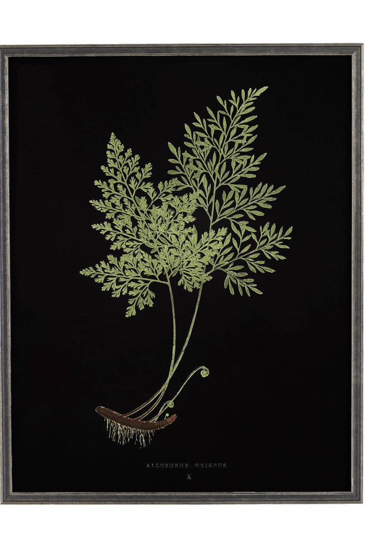 Add natural beauty to your walls with a gallery of forest ferns, their intricate lacy forms displayed against an inky black ground. A vintage black and silver frame lends an elegant edge to this archival collection of four delicate botanical renderings, available in two sizes. Set under glass, all artwork arrives ready for display. Hang a gallery of varied species and sizes, or choose from 1. Parsley fern, 2.Common Polypody, 3.Hollyfern, 4.Fragile fern.
