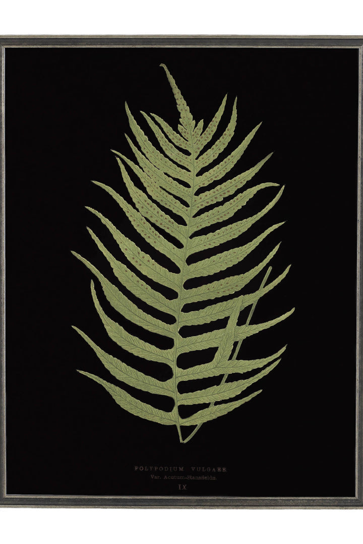 Add natural beauty to your walls with a gallery of forest ferns, their intricate lacy forms displayed against an inky black ground. A vintage black and silver frame lends an elegant edge to this archival collection of four delicate botanical renderings, available in two sizes. Set under glass, all artwork arrives ready for display. Hang a gallery of varied species and sizes, or choose from 1. Parsley fern, 2.Common Polypody, 3.Hollyfern, 4.Fragile fern.