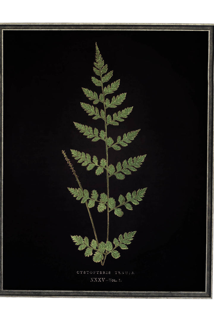 Add natural beauty to your walls with a gallery of forest ferns, their intricate lacy forms displayed against an inky black ground. A vintage black and silver frame lends an elegant edge to this archival collection of four delicate botanical renderings, available in two sizes. Set under glass, all artwork arrives ready for display. Hang a gallery of varied species and sizes, or choose from 1. Parsley fern, 2.Common Polypody, 3.Hollyfern, 4.Fragile fern.