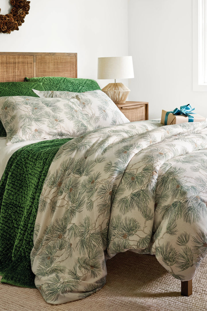 The poetic, rustic simplicity of whispy pine needles, cones, and boughs delicately printed on our substantial, heirloom cotton/flaxen blend gives an antique quality to this sham cover.