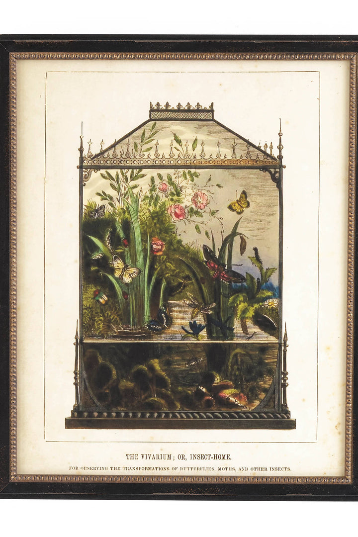Along with pteridomania, (the craze for ferns), the 19th century trend for vivariums, or enclosed glass containers containing soil, plants and insects, was encouraged by the public's interest in science and exploration. This gorgeous illustration shows a cross section of this "place for life" complete with butterflies, dragonflies, moths, caterpillars, nymphs, ferns, flora, pondwater, soil and rocks. The entire original vintage bookplate is reproduced, framed with a black and silver beaded frame and arrives ready to hang.