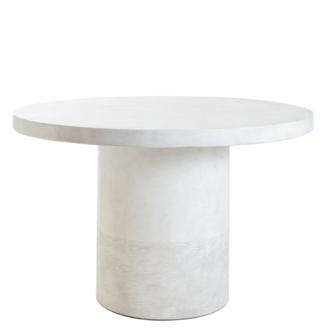 Bold, round and modern dining table comfortably accommodates four diners indoors or out. The neutral and sophisticated aesthetic has a sleek top with a central cylinder, sculpturally accented with textural detailing. Handmade with glass fiber reinforced concrete that weighs less, is more durable and more sustainable to produce than traditional concrete.
