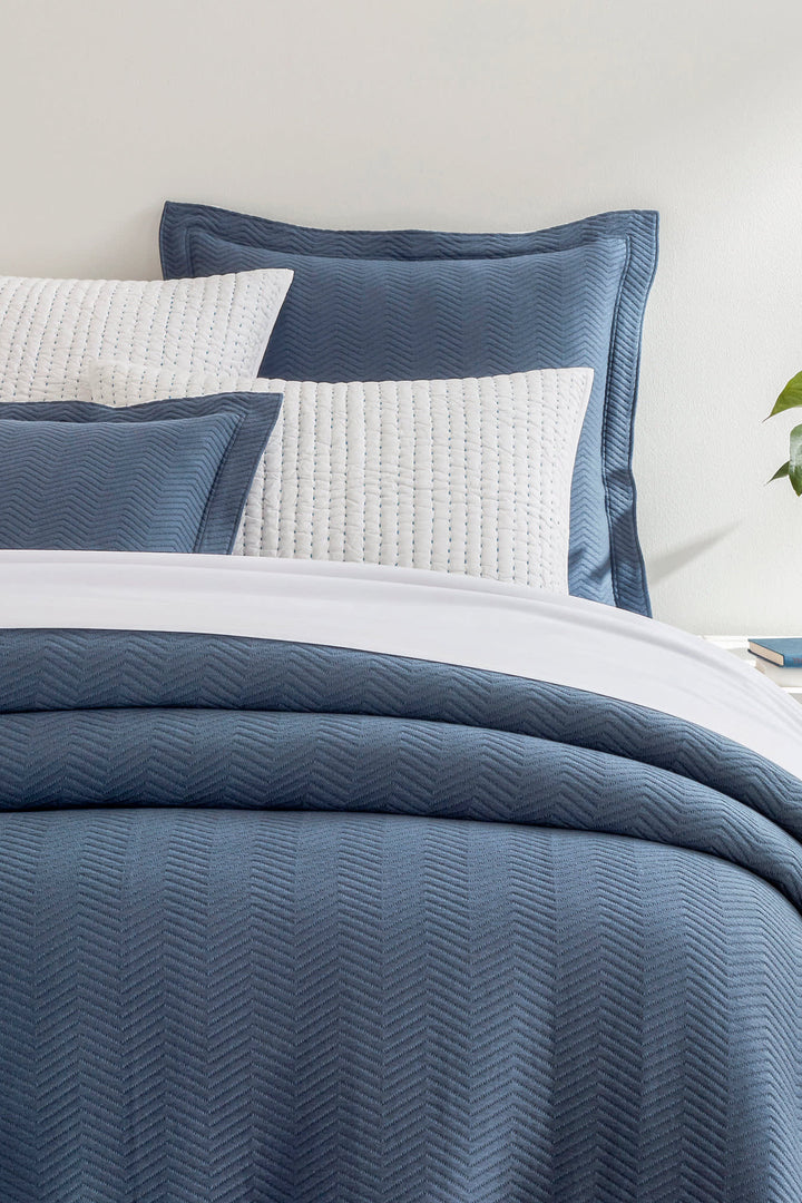 Horizontal chevrons bring a geometric update to this versatile, 100% cotton matelassé. The densely woven, traditional construction mimics finely quilted handwork. The result? A lightweight, luxurious layer that easily transitions through all the seasons. Made on traditional looms in a centuries-old mill in Portugal.