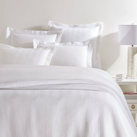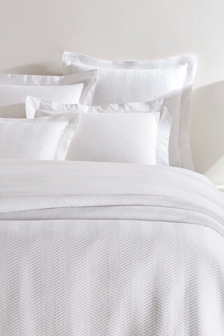 Horizontal chevrons bring a geometric update to this versatile, 100% cotton matelassé. The densely woven, traditional construction mimics finely quilted handwork. The result? A lightweight, luxurious layer that easily transitions through all the seasons. Made on traditional looms in a centuries-old mill in Portugal.