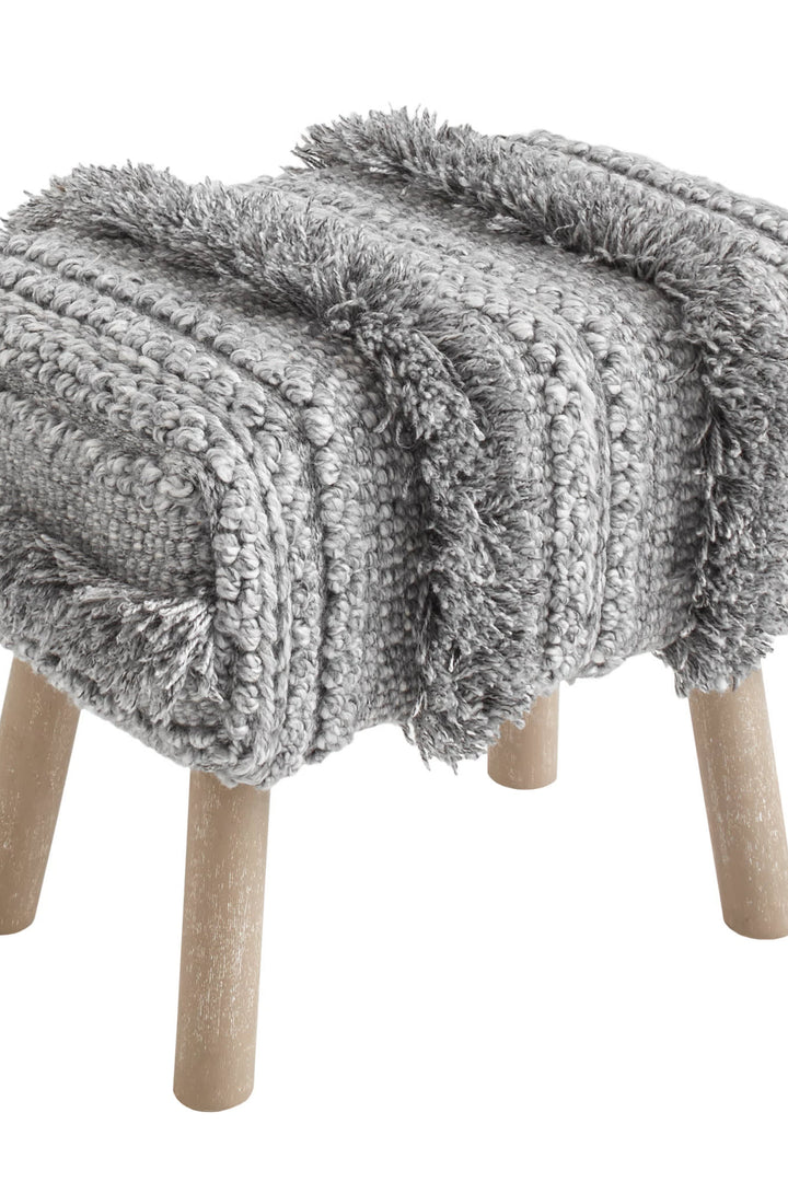 Use this adorable mini rug ottoman as an occasional stool, footrest, or vanity bench. Sumptuously upholstered in "wool-touch" eco-friendly performance fibers atop sturdy round cerused wooden legs. Stripes of nubby knots and sultry shag give it a luxe, textured flair, creating a perfect perch for brightening any room or entryway.