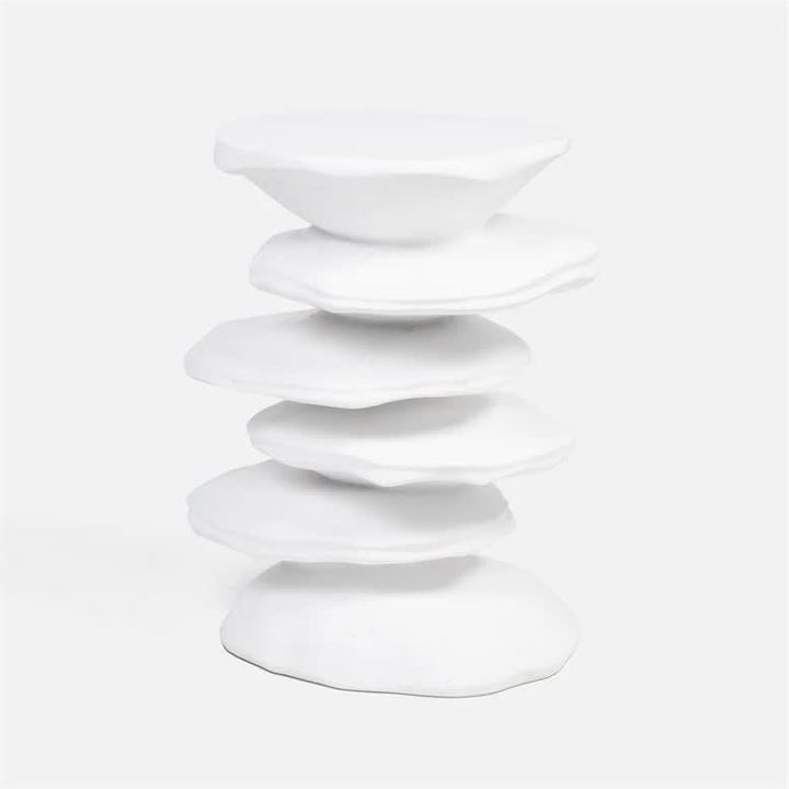 A contemporary sculptural table that emulates stacked stones can also be a plinth for a vase or objet. This unique sacred cairn table will bring serenity and balance to your sanctuary space. Constructed from modern white resin.